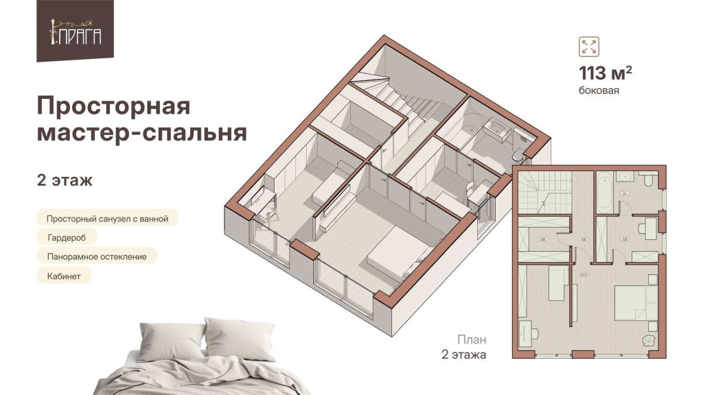 Второй этаж — приватная зона отдыха для хозяев дома. Спальня с большими окнами с прямым доступом в гардеробную. Просторная ванная комната с двумя раковинами и большим зеркалом – удобно собираться на работу по утрам.