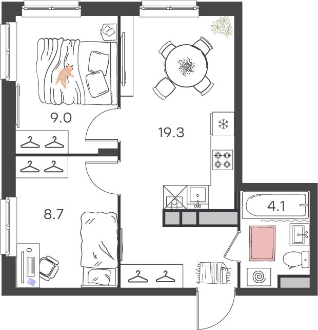 Площадь (кв.м.) Общая: 41.1 Жилая: 17.7 Кухня: 19.3 Комнаты: 8.7+9 41.1 / 17.7 / 19.3