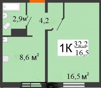 | Площадь (кв.м.) | Общая: 32.2 Жилая: 16.5 Кухня: 8.6 32.2 / 16.5 / 8.6 |