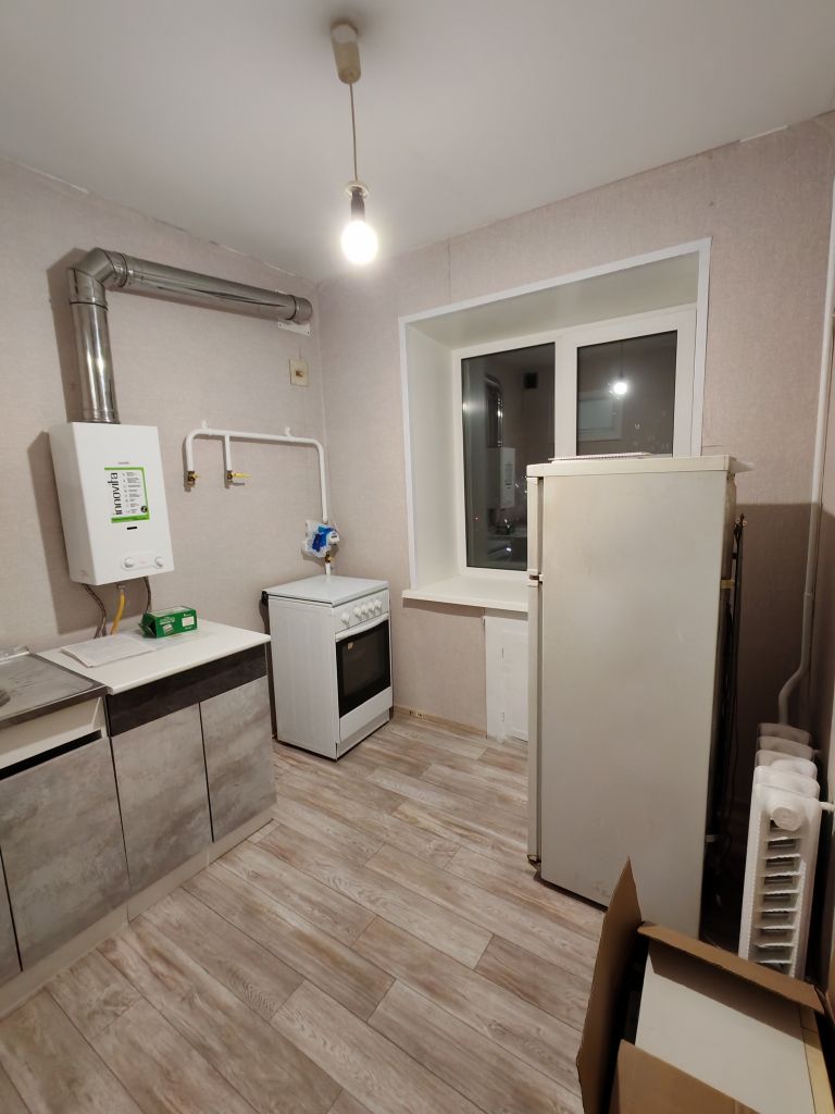 В квартире сделан косметический ремонт. На полу линолеум, санузел совмещенный. На кухне установлено пластиковое окно, новая газовая колонка.